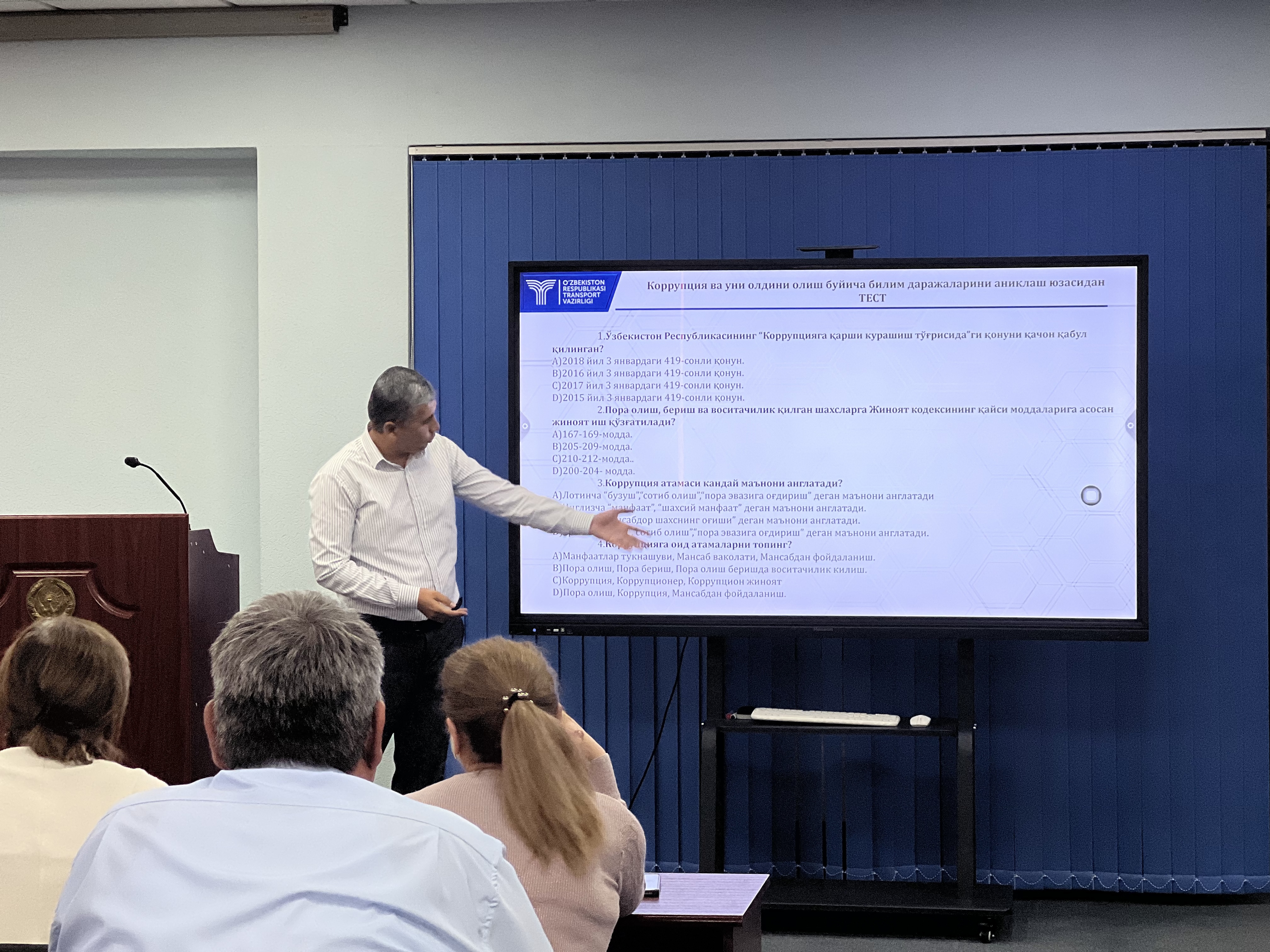 Тадбирда «Ўзавиация» агентлиги директори T.Назаров ва Тошкент авиация транспорт прокурори адлия катта маслаҳатчиси Ш. Мамаджанов, Ўзбекистон Республикаси Транспорт вазирлиги Коррупцияга қарши курашиш бўлими бошлиғи Н. Комилов, «Ўзавиация» агентлиги етакчи мутахассиси О. Пўлатовлар «Коррупцияга қарши курашиш – жамият тараққиётининг кафолати» ҳақида маъруза қилдилар.